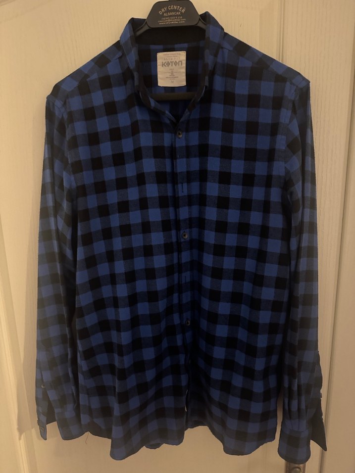Erkek oduncu gömleği, uzun kollu, düğmeli ve yakalıdır. Normal kesim, koyu mavi kareli desen ve pamuk kumaştan yapılmıştır. Günlük sokak giyimi için uygundur.