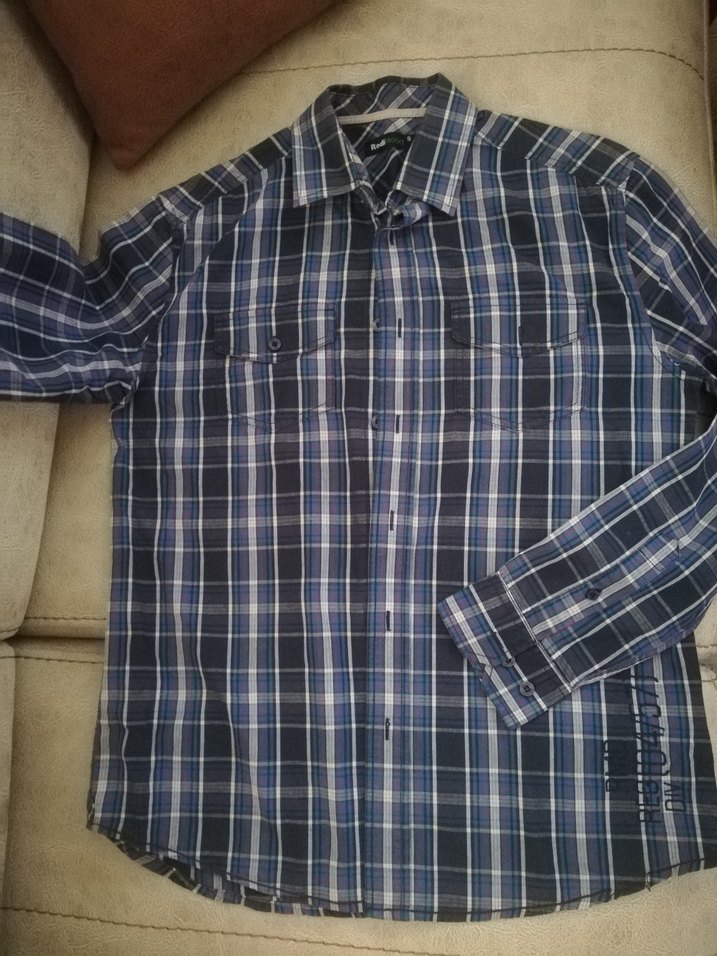 Bu erkek uzun kollu gömlek, yakalı ve düğmeli ön yapıya sahip olup, sentetik kumaştan üretilmiş mavi kareli desene sahiptir.
