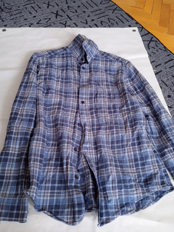 Erkekler için rahat kesim, uzun kollu, yakalı ve düğmeli mavi kareli gömlek. Yumuşak keten kumaştan üretilmiştir.