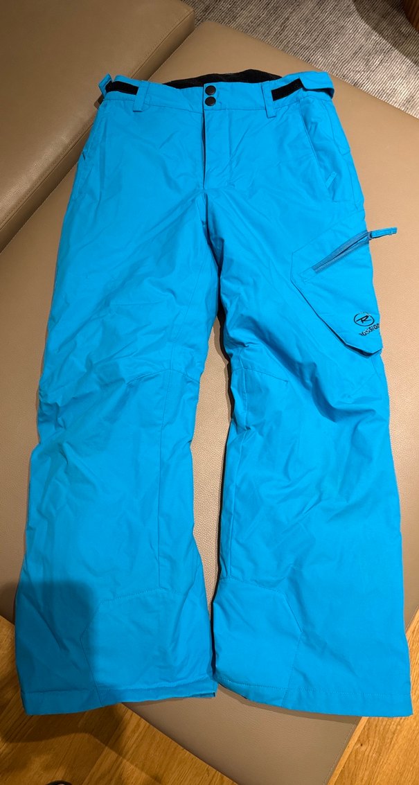 Parlak mavi renkte, fermuarlı ceplere sahip, sentetik kumaştan yapılmış erkek kayak pantolonu. Rahat kesimi ve midi boyu ile outdoor ve athleisure tarzına uygun.