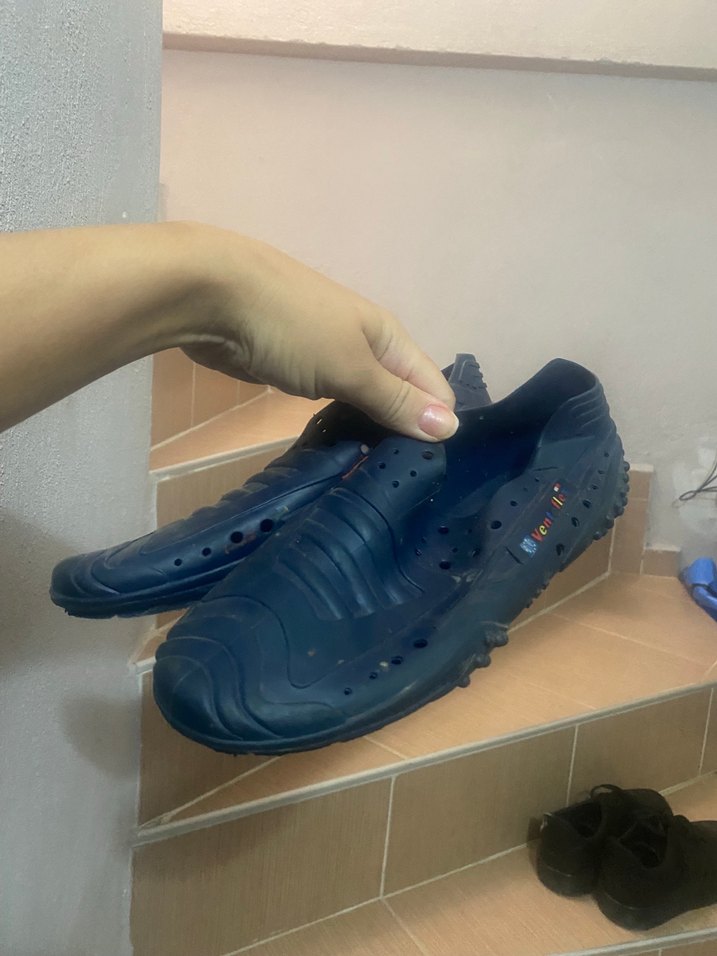 Koyu mavi renkte, kauçuk malzemeden üretilmiş, cırt cırtlı erkek su ayakkabısı. Günlük, sokak ve athleisure tarzlarına uygun.