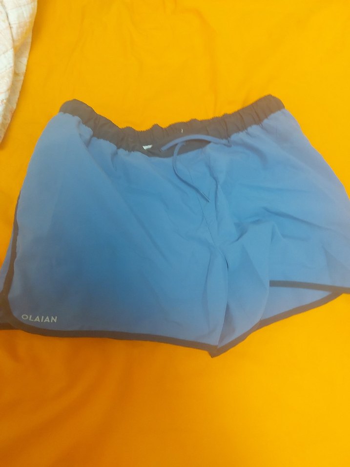 Erkekler için bol kesim şort. Düz mavi ve gri tonlarda, plajda rahat kullanım için uygundur. OLAIAN marka etiketli.