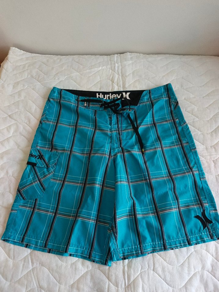 Erkekler için kemerli, bol kesim, koyu mavi kareli desenli şort mayo. Plaj ve rahat athleisure tarzına uygun.