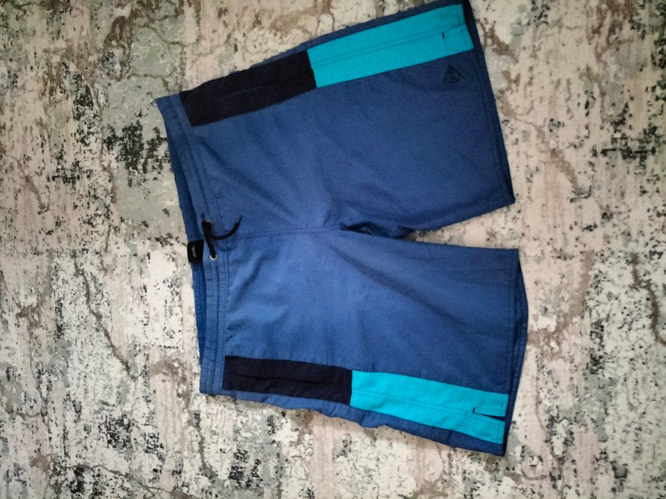 Erkekler için kemerli, bol kesim ve kısa boyda, sentetik kumaştan yapılmış koyu mavi spor şort. Renk bloklu detaylarıyla sokak stiline uygun.