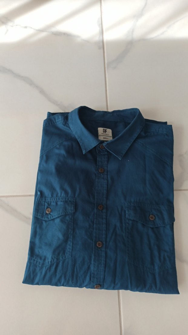 Erkekler için uzun kollu, düğmeli, koyu mavi renkli, rahat kesim gömlek. Günlük kullanıma uygundur.