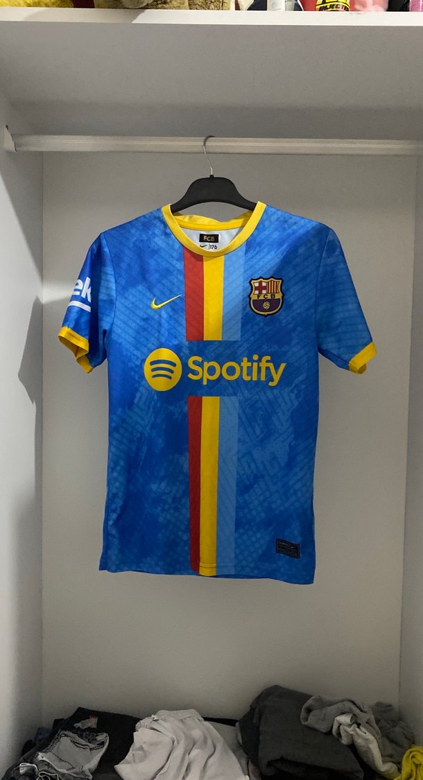 Erkek mavi kısa kollu, yuvarlak yakalı Barcelona forması. Sentetik kumaştan, bol kesim, Spotify baskılı ve düğmeli detaylara sahip. Spor ve sokak tarzı örneği. ⚽