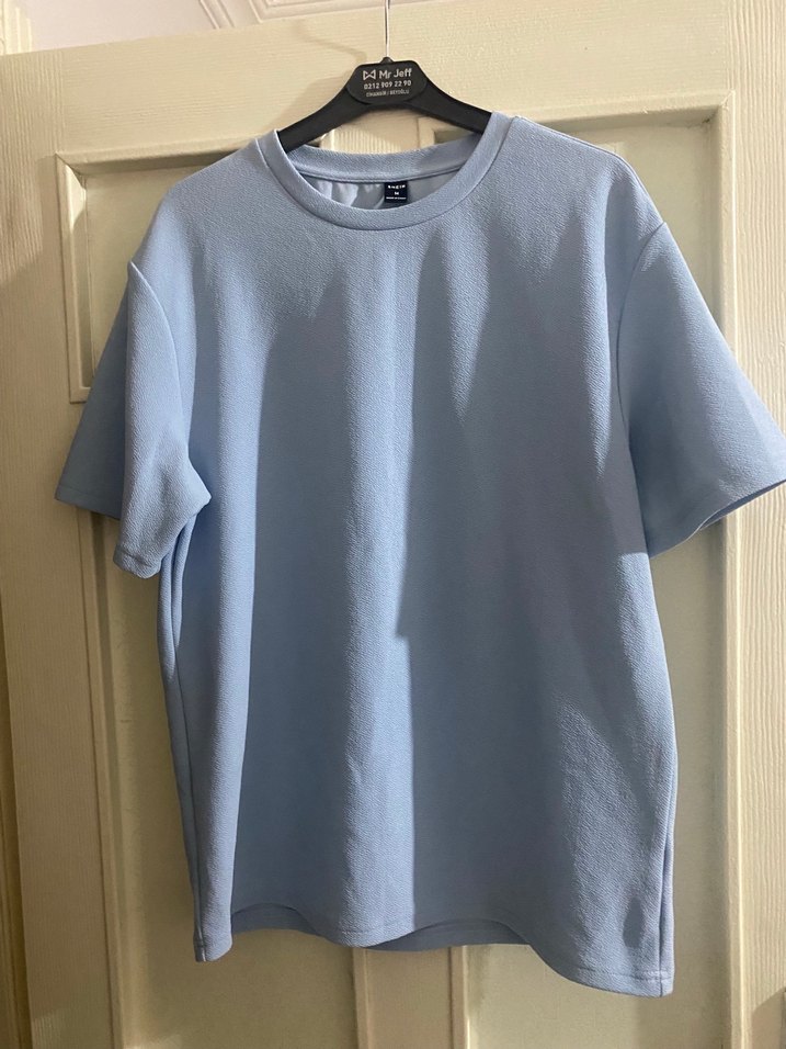 Erkek tişörtü, kısa kollu ve bisiklet yaka olarak tasarlanmıştır. Bol kesim, normal boy ve pastel mavi renkte, yumuşak ve sıcak kumaştan üretilmiştir. Düz, minimal stil günlük kullanım için uygundur.