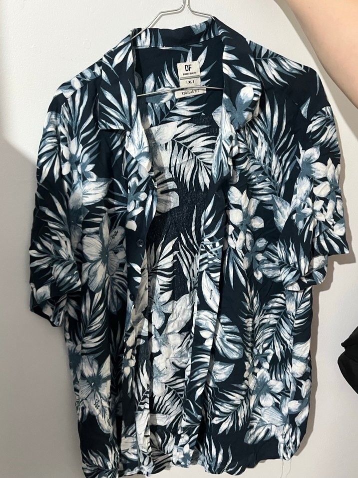 Erkekler için kısa kollu, bol kesim ve yakalı gömlek. Düğmeli, koyu mavi yaprak desenli, sentetik kumaştan. Rahat sokak stili için uygun.