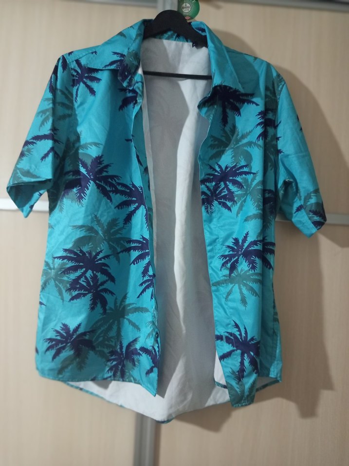 Erkekler için bol kesim, kısa kollu, mavi palmiyeli batik desenli gömlek. Sentetik kumaştan, düğmeli ve parlak görünümlü, günlük sokak stili için uygun.