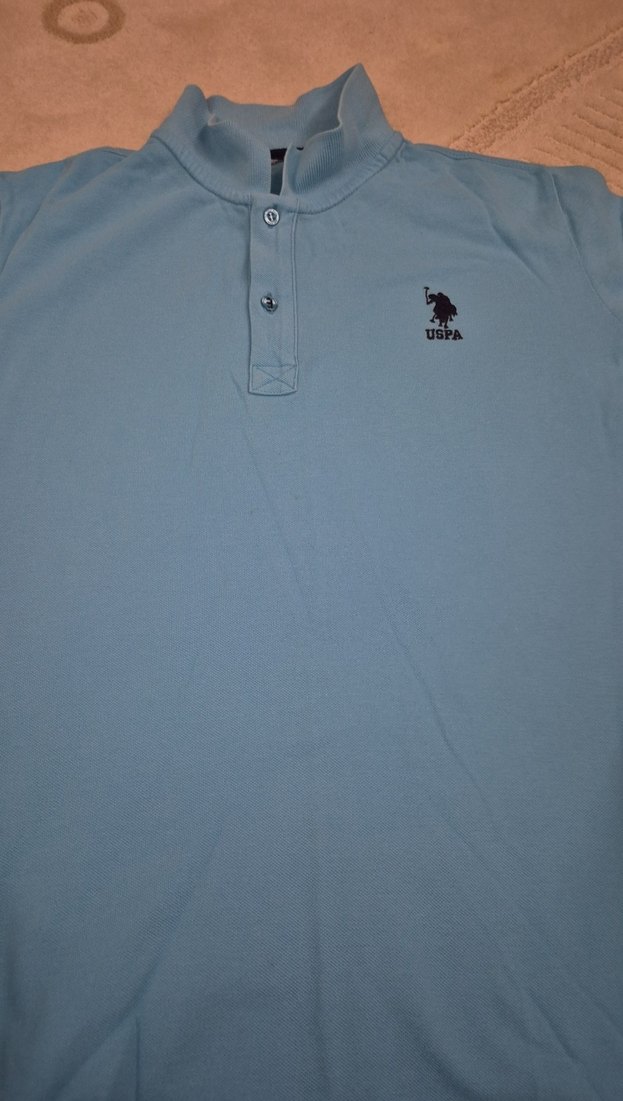 Pastel mavisi, düğmeli yakalı ve kısa kollu erkek polo tişörtü. İnce kesimli ve yumuşak, sıcak kumaştan, gündelik sokak stili için uygun.