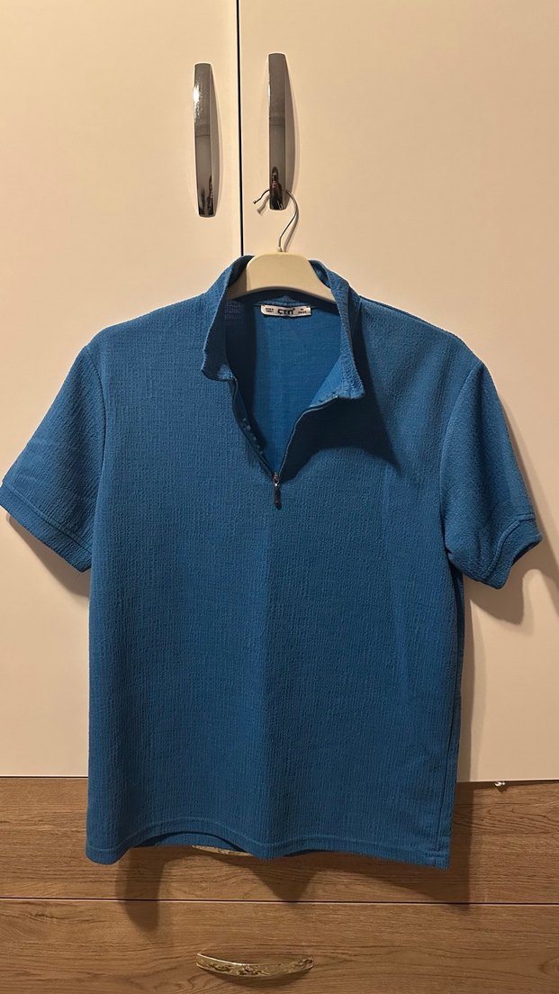 Erkekler için kısa kollu, fermuarlı yakalı, bol kesim mavi polo tişört. Keten kumaştan, parlak renkte, günlük ve sokak stiline uygun.