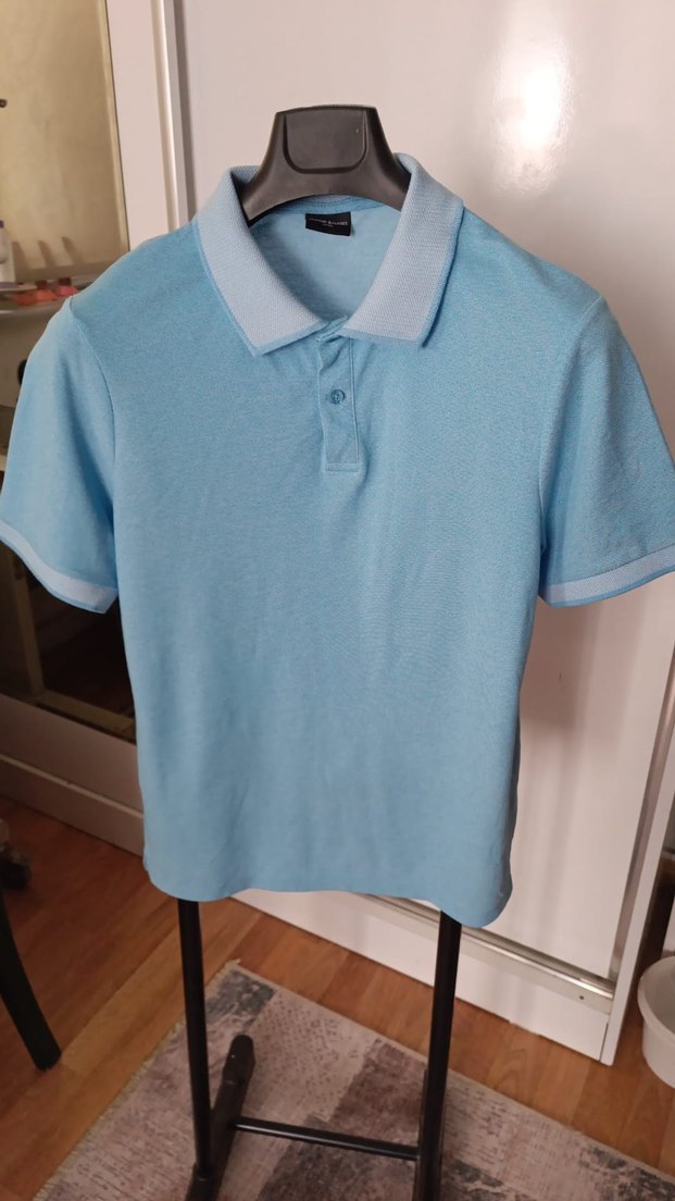 Açık mavi kısa kollu, düğmeli yakalı polo tişört. Düz, sentetik kumaştan, rahat kesim, günlük sokak stiline uygun.