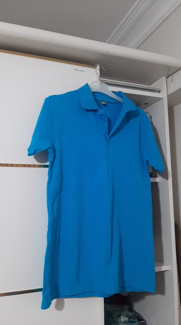 Erkekler için mavi renkli, kısa kollu, polo yaka tişört. Hafif sentetik kumaştan, bol kesim ve normal boyda. Günlük rahat sokak stili için uygundur. okul içinde uygundur