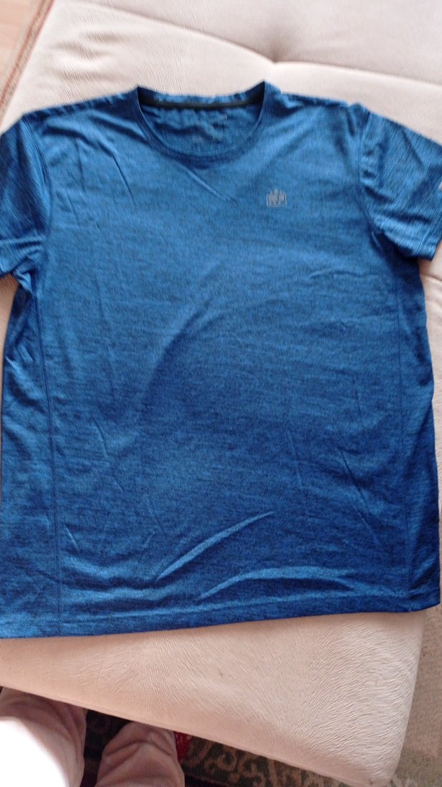 Erkek mavi tişört, kısa kollu ve yuvarlak yakalıdır. Salaş kesimi ve yumuşak sentetik kumaşı rahatlık sağlar. Spor ve gündelik kullanıma uygundur.