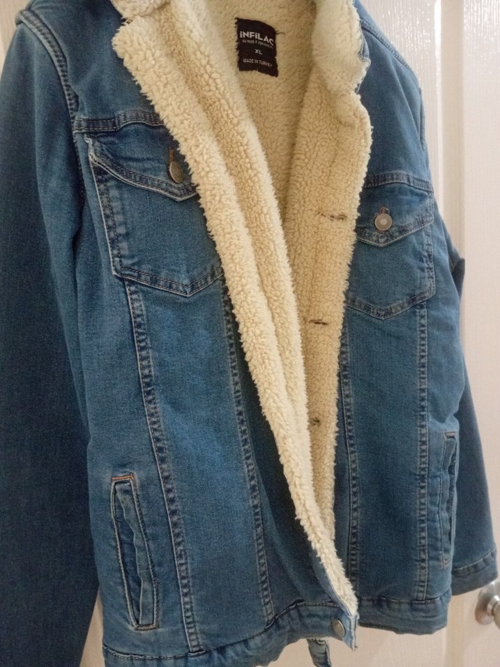 Mavi denim ceket, bol kesim ve sıcak kürk detayları ile rahat bir kullanım sunar. Notched lapel yakalı ve uzun kolludur. ✨