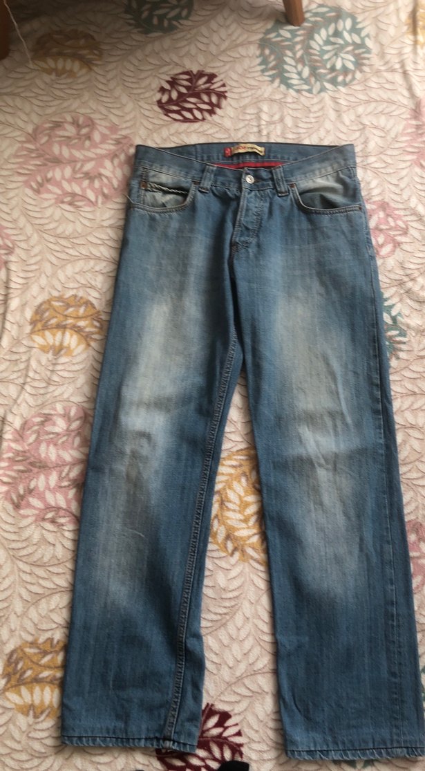 Erkekler için bol kesim, kuşaklı, mavi-gri tonlarında denim pantolon. Normal boyda, hafif batik desenli, günlük kullanıma uygun.