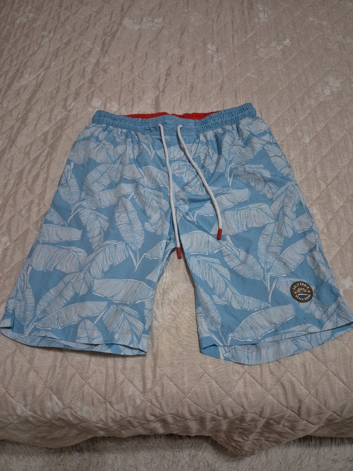 Mavi renkli, düğmeli detaylı, gri desenli, rahat kesim erkek şort, plaj ve günlük kullanım için uygundur. arkada hafif leke var