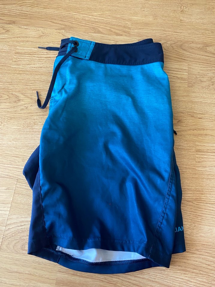 Erkekler için koyu mavi, bol kesim, kemerli midi boy şort. Plajda rahat kullanım ve sade sokak stili sunar.