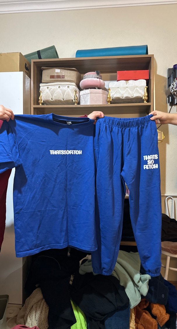 Erkekler için koyu mavi, kısa kollu, yuvarlak yakalı, rahat kesim tişört ve pantolon takımı. Üzerinde beyaz 'THATS SO FETCH' yazısı bulunur. ️