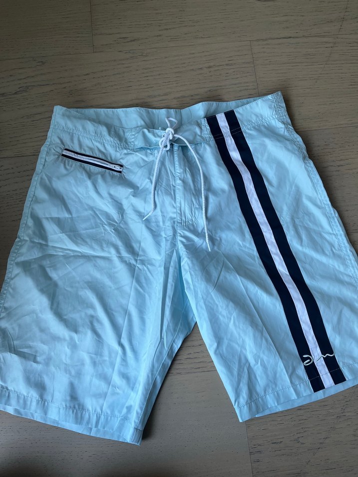 Ürün sıfırdır Erkekler için pastel mavi renkte, midi boy ve bol kesim yüzme şortu. Fermuarlı cep ve spor çift şerit detayı bulunur.