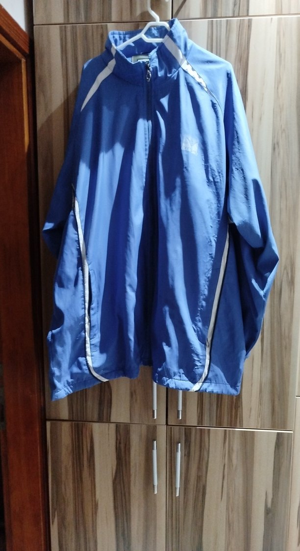 Erkekler için parlak mavi sentetik kumaştan, yüksek yakalı ve fermuarlı midi boy rüzgarlık. Uzun kollu, bol kesim, spor ve sokak stili için uygundur. Desensiz tasarım.