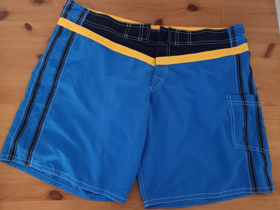 Parlak mavi renkte, sarı şerit detaylı, kemerli ve bol kesim erkek midi deniz şortu. hiç kullanılmadı yeni