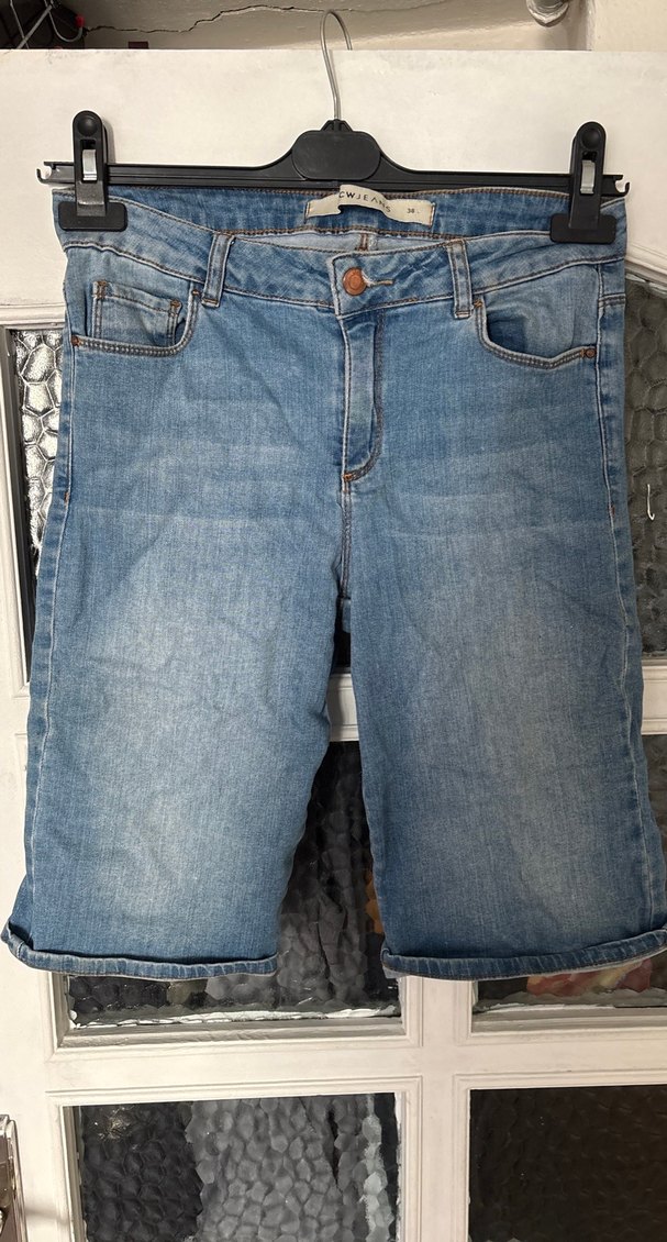 Gri tonlarında mavi, tokalı detaylı, bol kesim kadın midi kot şort. Günlük rahat sokak stili için uygundur.
