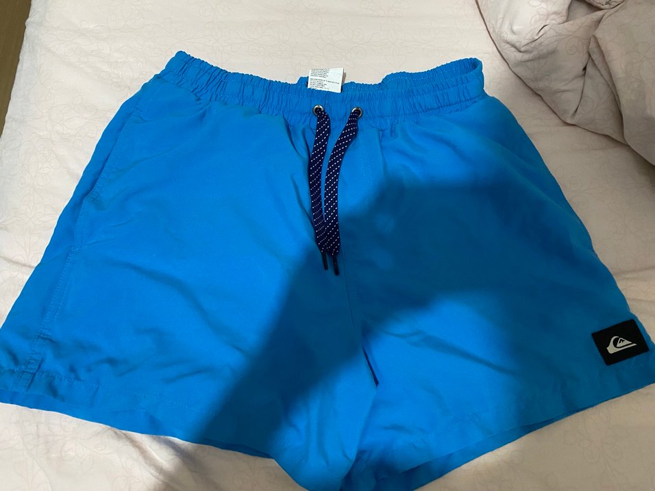 Parlak mavi renkte, fermuarlı ve lastikli bel detaylı, normal boyda erkek yüzme şortu.