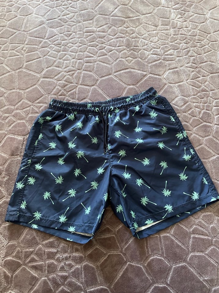 Erkekler için düğmeli, bol kesim, koyu mavi mini şort, palmiye ağacı desenli, plaj ve gündelik kullanım için uygun.