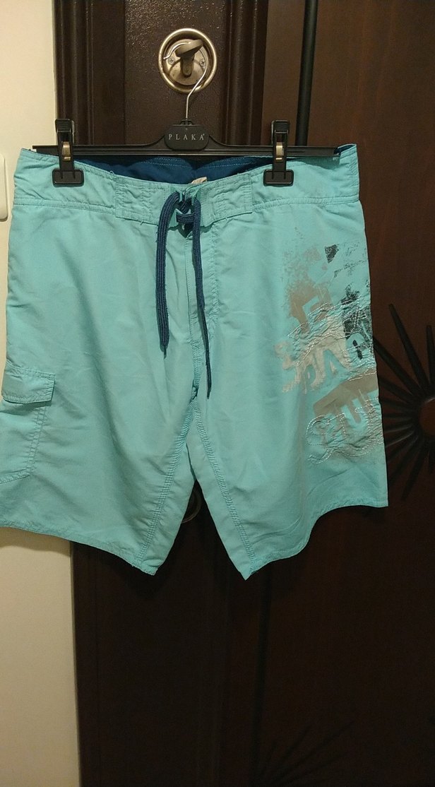 Erkekler için bol kesim, kemerli ve bağcıklı pastel mavi deniz şortu. Yumuşak sentetik kumaştan, sahil ve günlük rahat stil için ideal.
