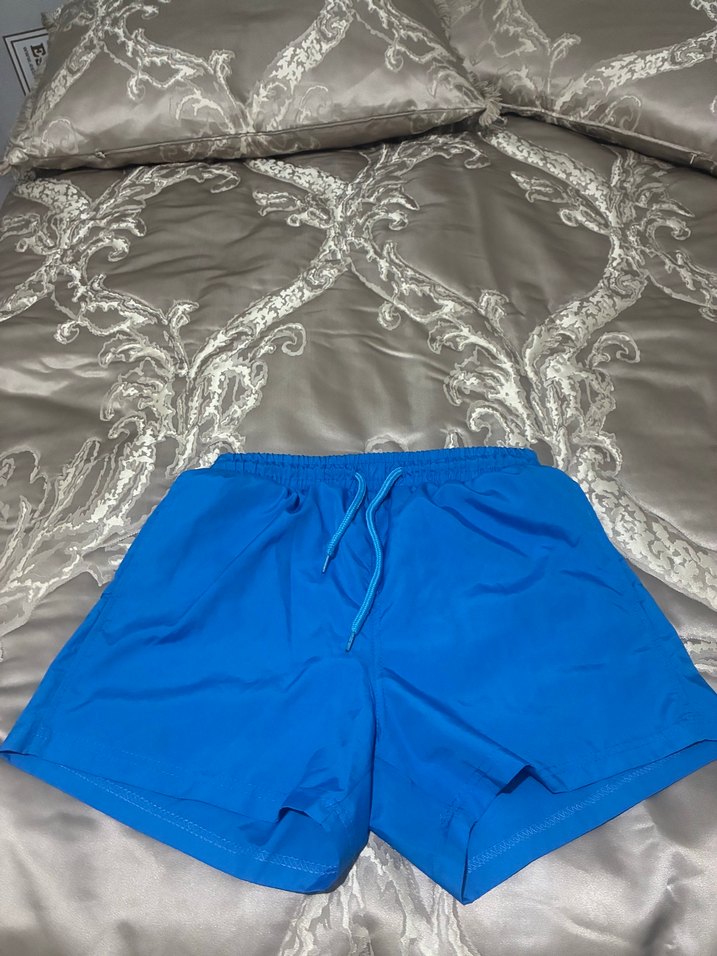 Erkekler için mavi, parlak yüzeyli ve bol kesim deniz şortu, plaj için sade ve rahat bir stil sunar.