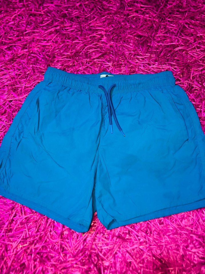 Canlı mavi renkte, rahat kesim, lastikli bel ve bağcıklı erkek mini mayo şortu.