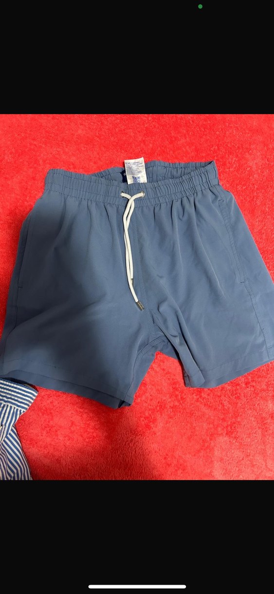 Erkekler için elastik bel bantlı, bağcıklı mavi mini yüzme şortu. Sentetik kumaştan üretilmiş, plaj ve sokak stiline uygun.