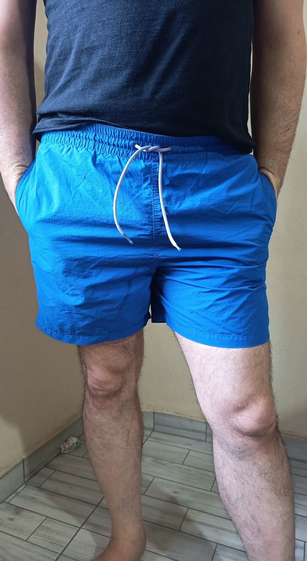 Erkekler için parlak mavi renkte, rahat kesimli ve belinde bağcıklı lastikli mini şort mayo. Plajda rahat ve şık kullanım için ideal.