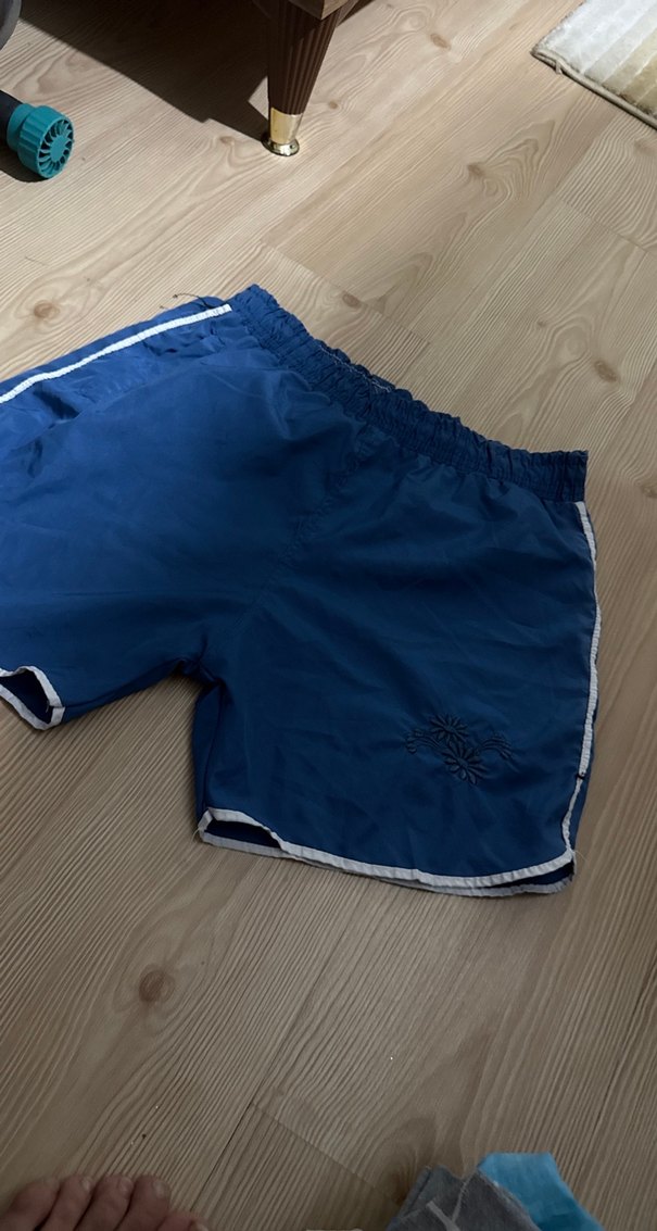 Geniş kesim, parlak mavi erkek yüzücü şortu, fermuarlı cep ve lastikli bel ile. Plaj ve sokak tarzı için uygun.