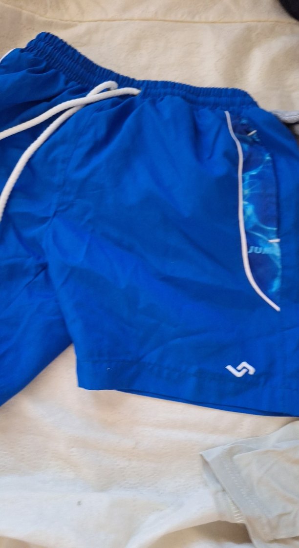 Erkekler için mavi mini spor şort, bol kesim ve fermuarlı ceplerle dış mekan sokak stiline uygun parlak görünüme sahip.