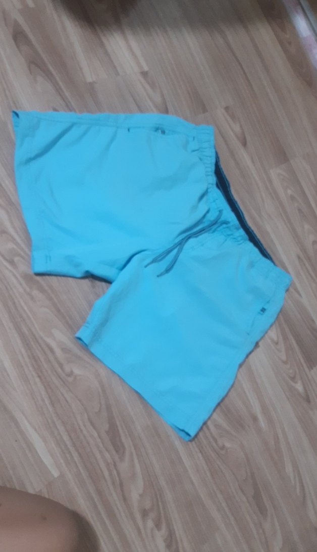 Pastel mavi renkte, düz ve desensiz, rahat kesim erkek yüzme şortu. Plajda kullanıma uygun, salaş ve konforlu tasarım.