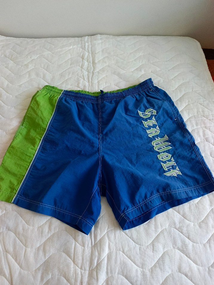 Parlak mavi renkli, yeşil yan panelli ve fermuarlı cep özellikli, bol kesim erkek mini yüzme şortu. Sahil ve spor tarzına uygundur.