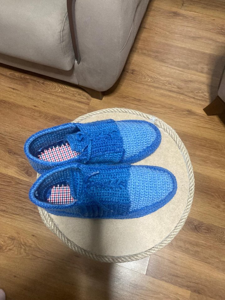 Erkekler için örgü, desen içermeyen canlı mavi tonlarda botlar. Rahat ve bohem tarzda, konforlu iç mekan kullanımı için uygundur.