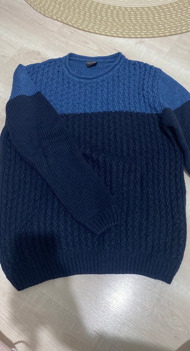 Erkekler için fitted kesim, örgü yapılı, crew neck ve uzun kollu kazak. Koyu mavi renk bloklu, rahat ve streetwear tarzında, günlük kullanım için uygundur.