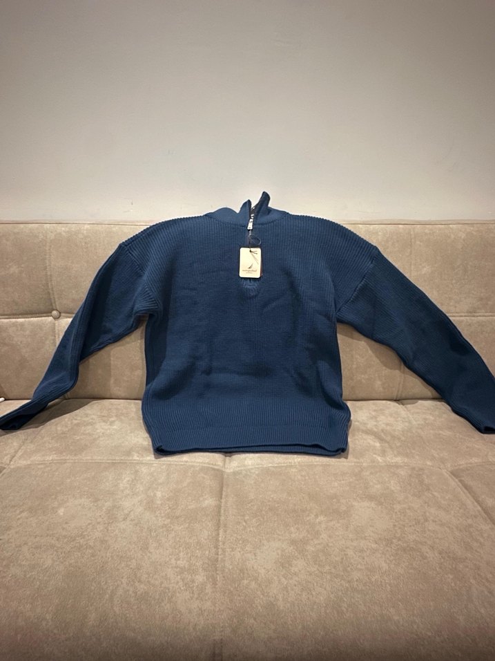 Erkekler için örgü, uzun kollu, yarım fermuarlı , rahat kesim mavi triko. Orta uzunlukta, desen içermeyen, gündelik kullanıma uygun sıcak kumaş.