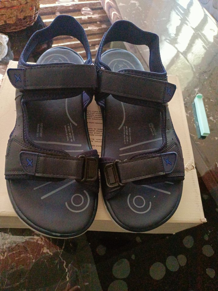 Erkekler için ayarlanabilir tokalı bantlara ve kauçuk tabana sahip, açık hava kullanımı için uygun koyu mavi renkli rahat sandaletler.