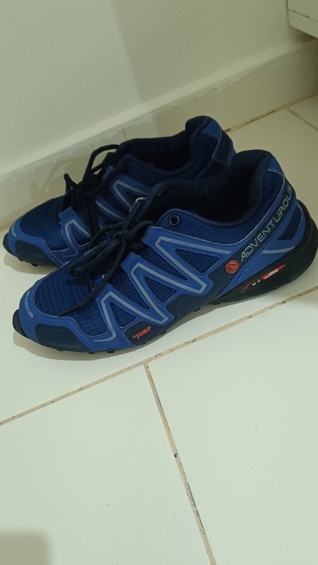 Erkekler için koyu mavi baskılı, kauçuk tabanlı ve Velcro bantlı spor outdoor ayakkabı, şık ve rahat sokak stili için uygun.