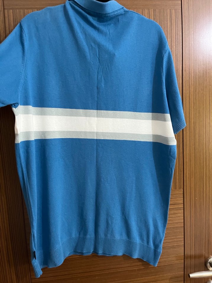 Erkek polo tişört, pamuklu yumuşak kumaştan, kısa kollu ve yakalıdır. Gevşek kesimi, parlak mavi rengi ve beyaz yatay şeridi vardır. Düğme detaylı, günlük kullanıma uygundur. Avva marka xxl yazıyo ama kalıbı daha dar