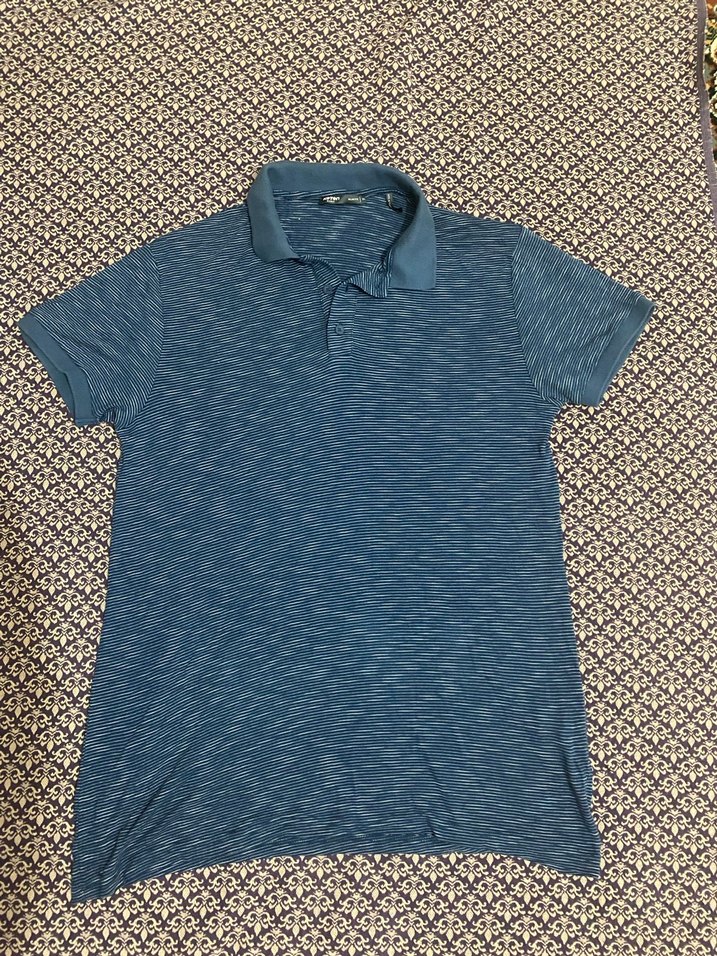 Mavi bağlama desenli, kısa kollu, düğmeli erkek polo tişörtü. Tekstil kumaştan, bol kesim ve normal boyda, günlük rahat kullanıma uygundur.
