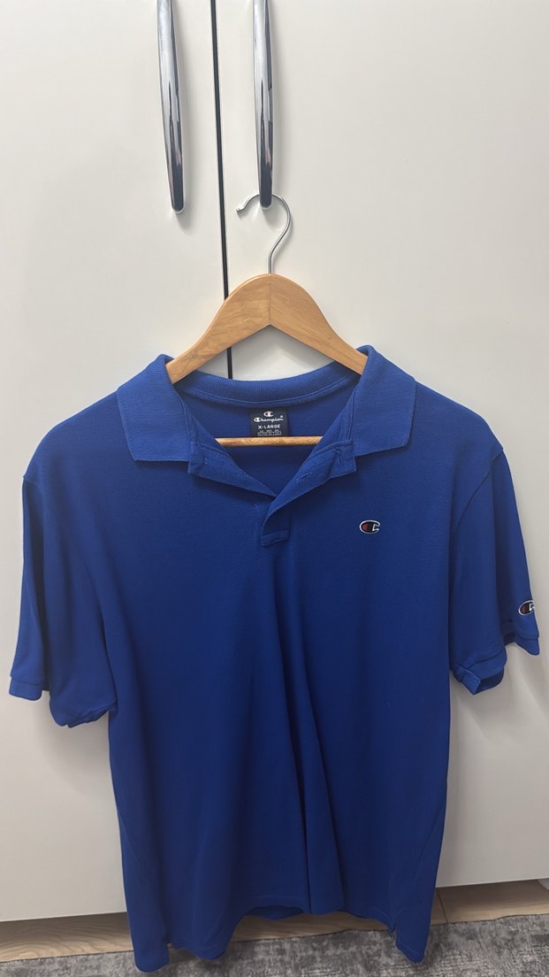 Erkekler için ince kesim, polo yakalı, kısa kollu tişört. Parlak mavi renkte, yumuşak ve sıcak kumaştan, düğmeli ve sportif tarzda.