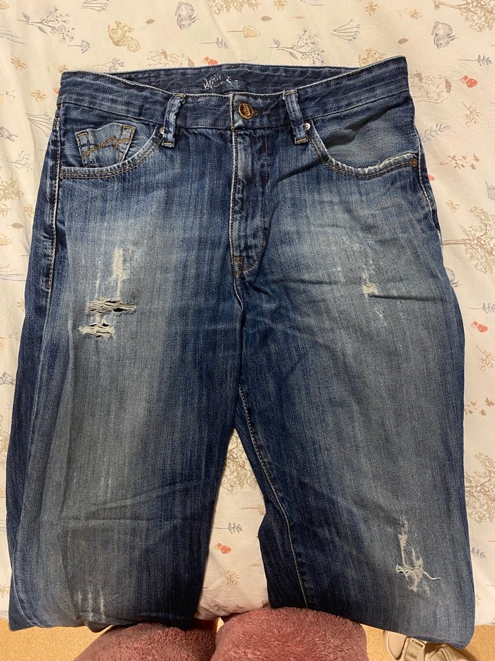 Erkekler için mavi renkli, rahat kesim ve normal boyda kot pantolon. Parlak kumaşı, tokalı detayları ve hafif yıpranmış görünümüyle günlük kullanım için uygundur.