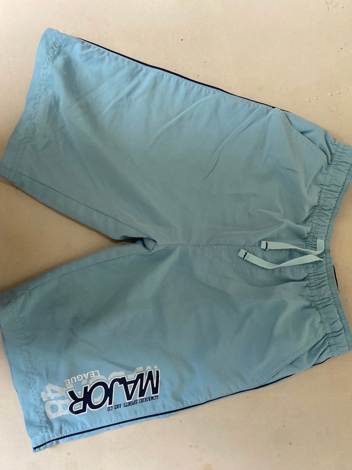 Erkekler için pastel mavi renkte, ceplere ve bağcıklı beli olan rahat kesim şort. Sentetik kumaştan üretilmiştir.