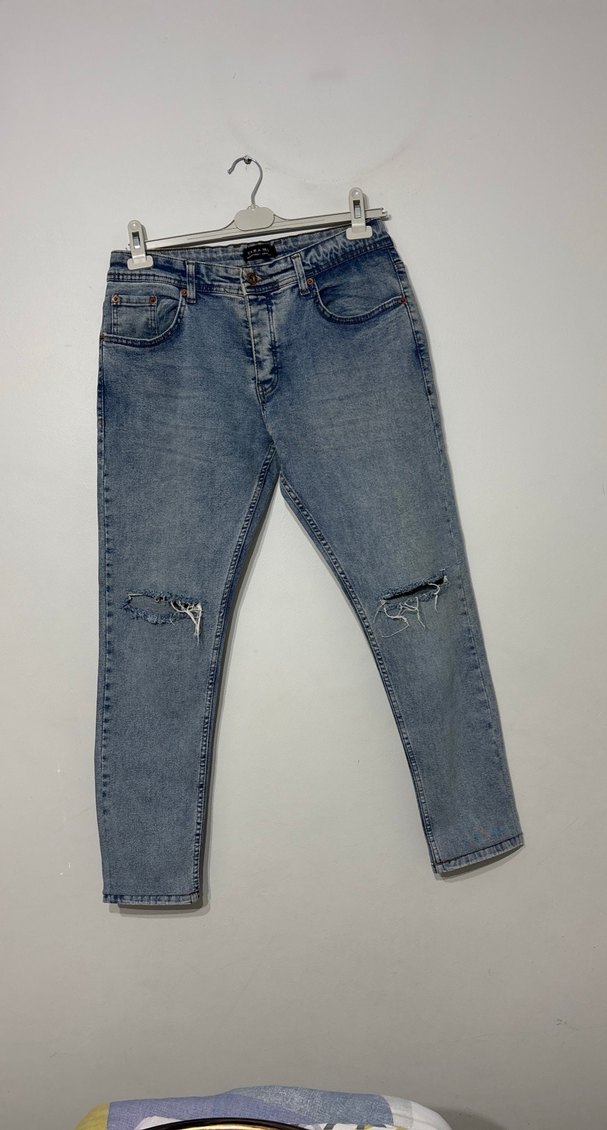 Mavi regular fit denim jean, dizlerde yırtık detaylı ve kemer tokalı, günlük rahat kullanıma uygun.