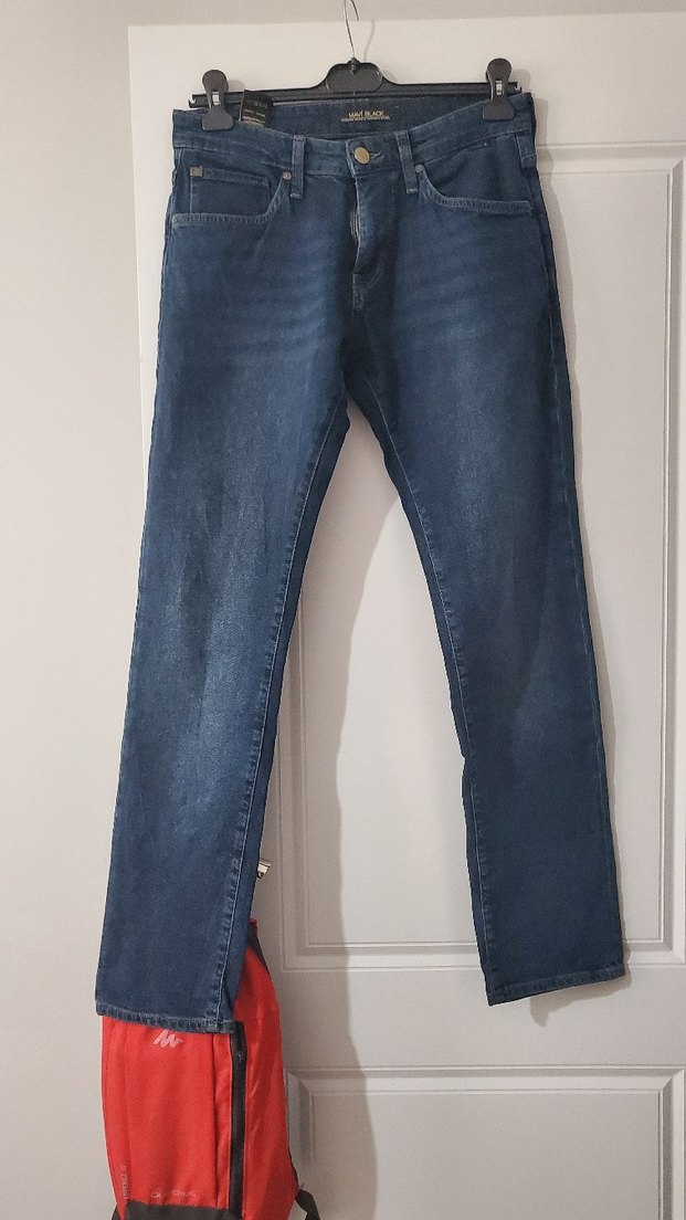 Erkekler için normal boy, regular fit mavi renkte, desen içermeyen, kemer tokalı denim kot pantolon. boy 103 cm bel 39 cm